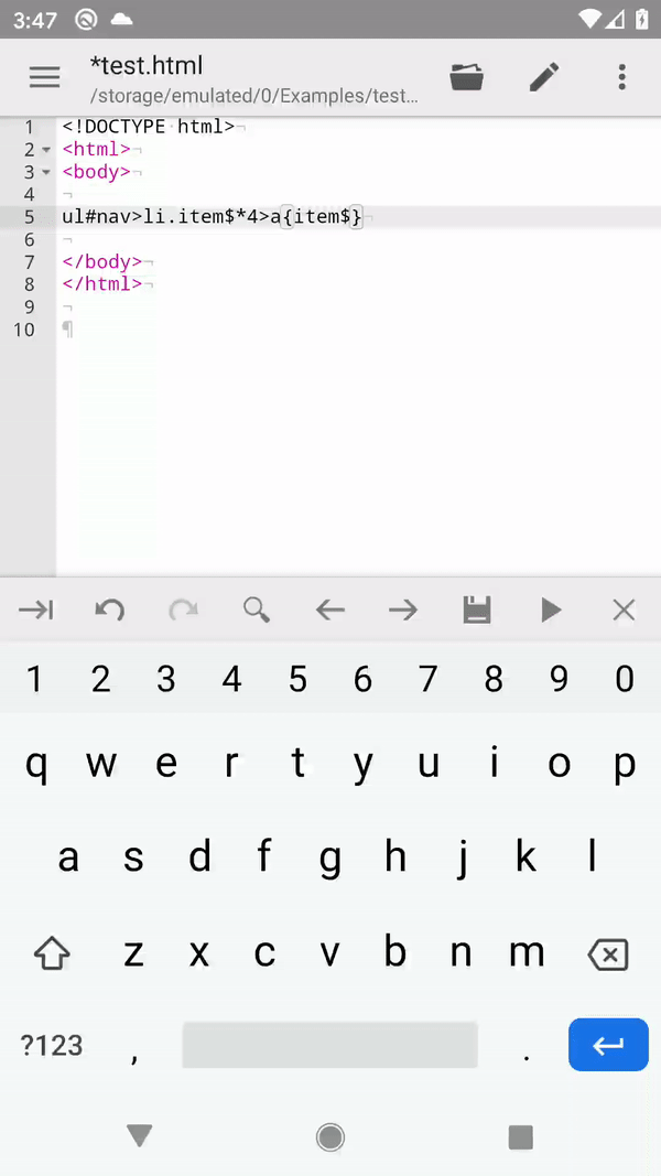 Support for Emmet snippets and expansion is built right into Code Editor.