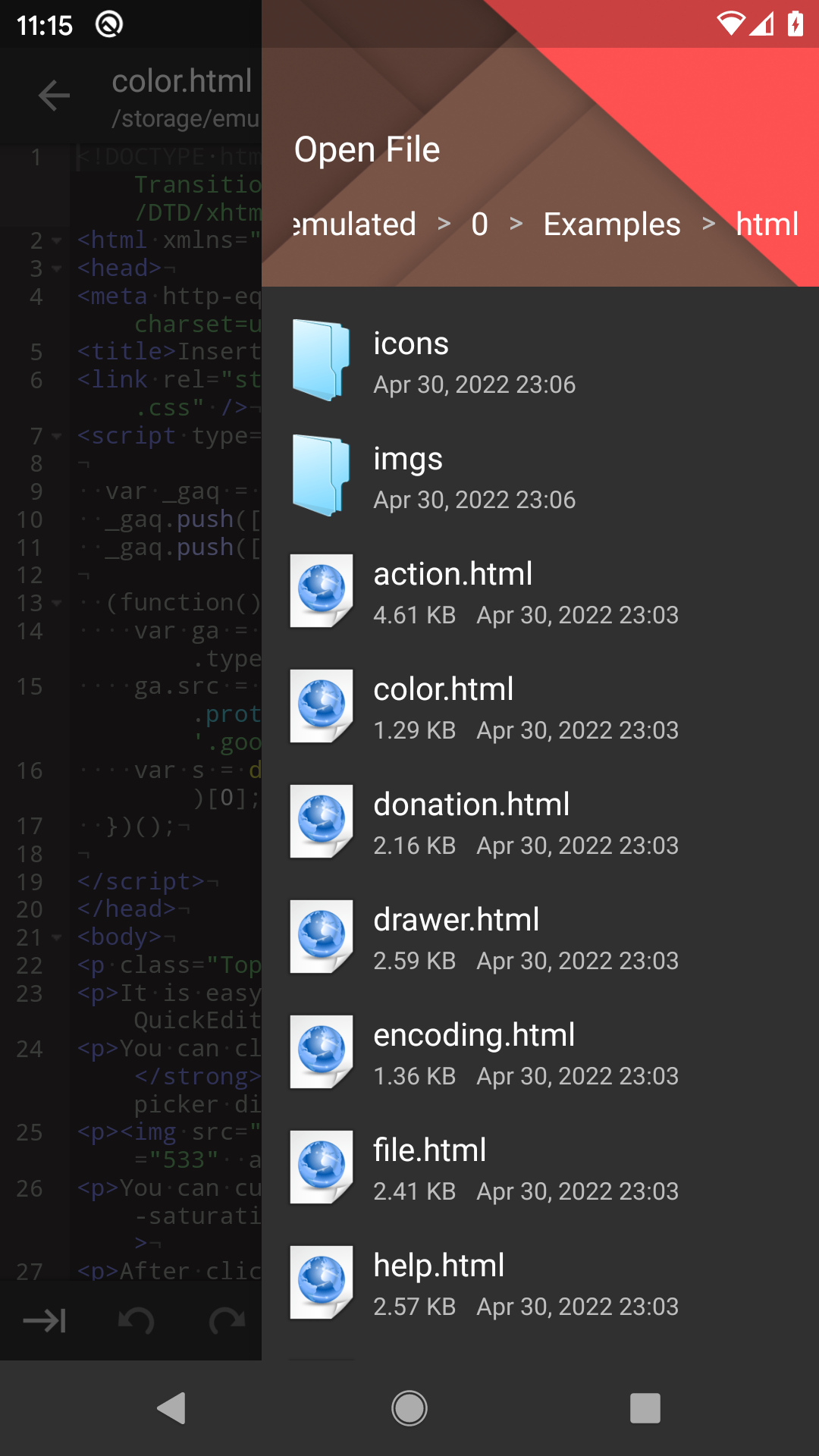 When you switch active editing file in Code Editor, the content of the folder drawer will change. For instance, when you edit a file from FTP, folder drawer will display file tree from FTP; when you edit another file from SD card in another tab, the folder drawer will display file tree from SD card.