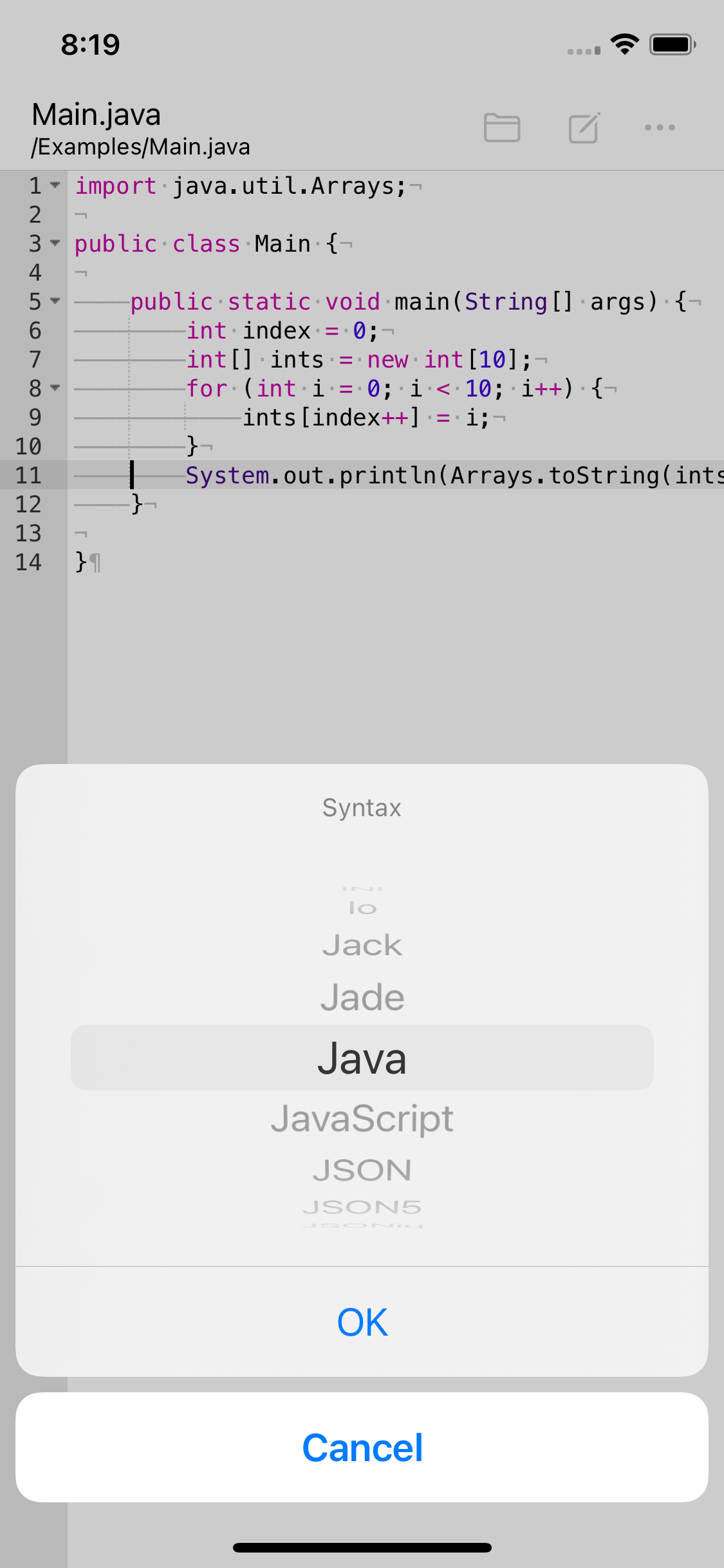 The syntax language is determined automatically from the file extension. For instance, "Main.java" will use Java language automatically.