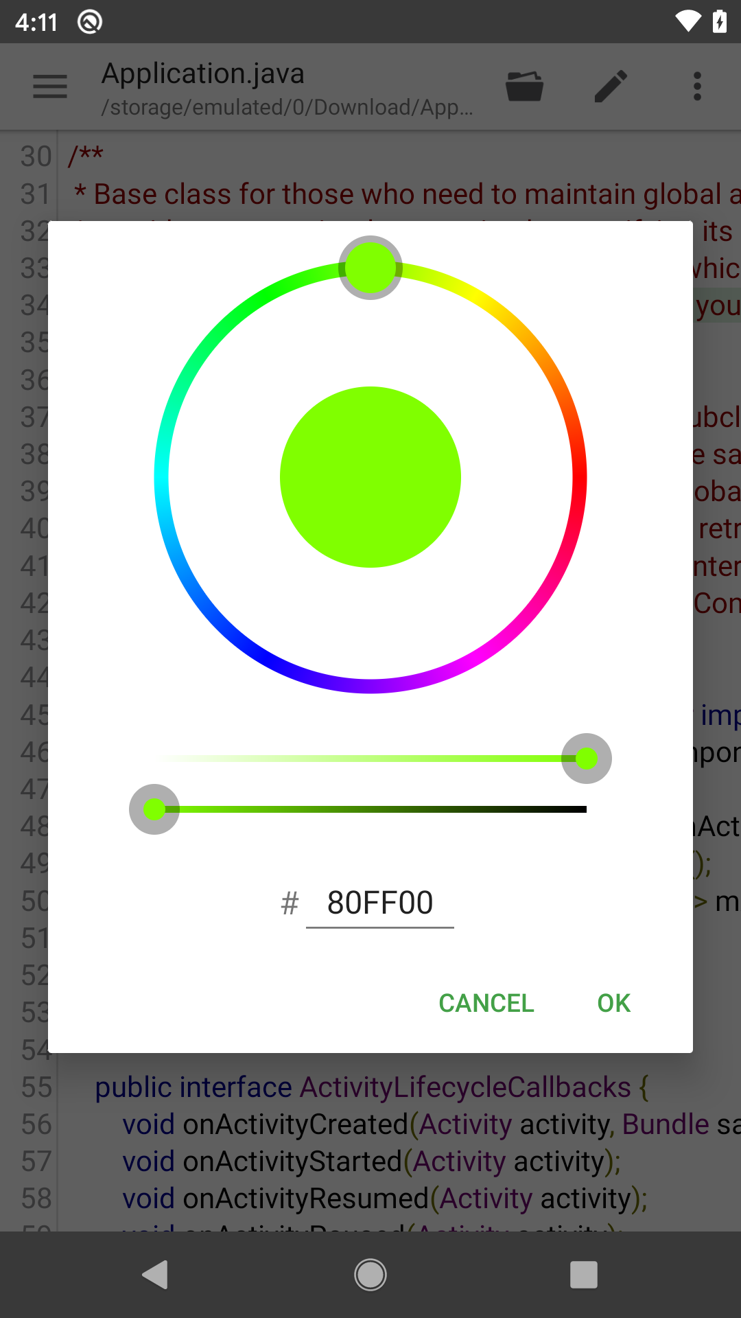 After clicking OK button, the color hex ("#80FF00" in above image) will be inserted into the text.