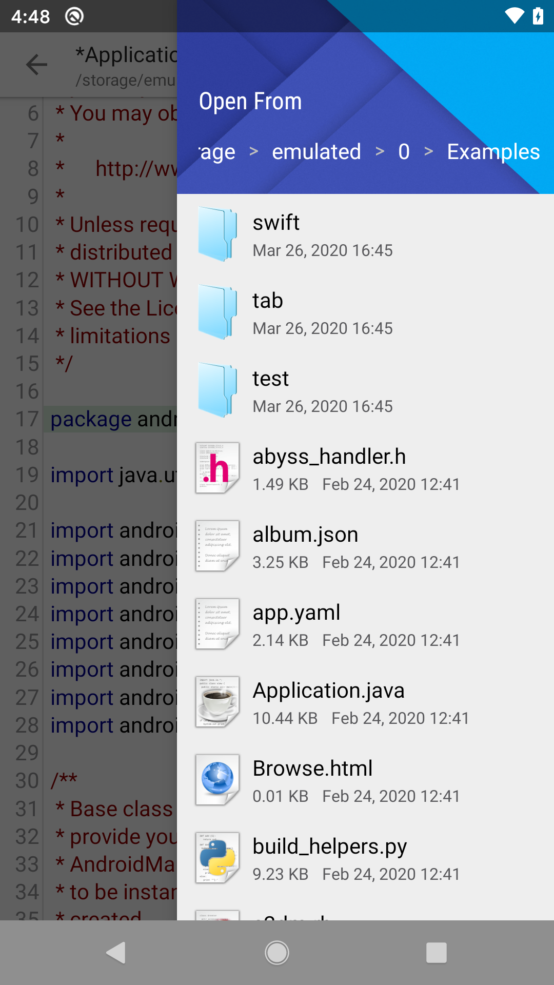 When you switch active editing file in QuickEdit, the content of the folder drawer will change. For instance, when you edit a file from Google Drive, folder drawer will display file tree from Google Drive; when you edit another file from SD card in another tab, the folder drawer will display file tree from SD card.